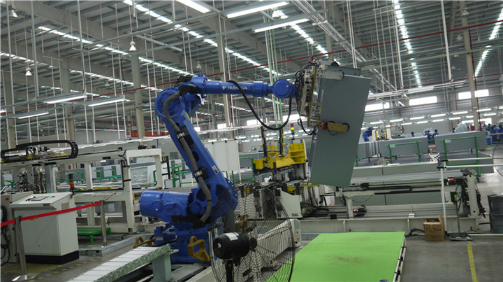 3、壓縮機自動化組裝。冰箱發泡后豎身45度、由機械手固定安裝壓縮機的工裝設備,目前已投入實際應用。機器人識別、搬取、固定壓縮機的裝備技術,改變了原先操作工身兼搬運工、甚至焊接工的情況,明顯降低了現場工人的勞動強度,成為冰箱生產自動化的重要環節之一。