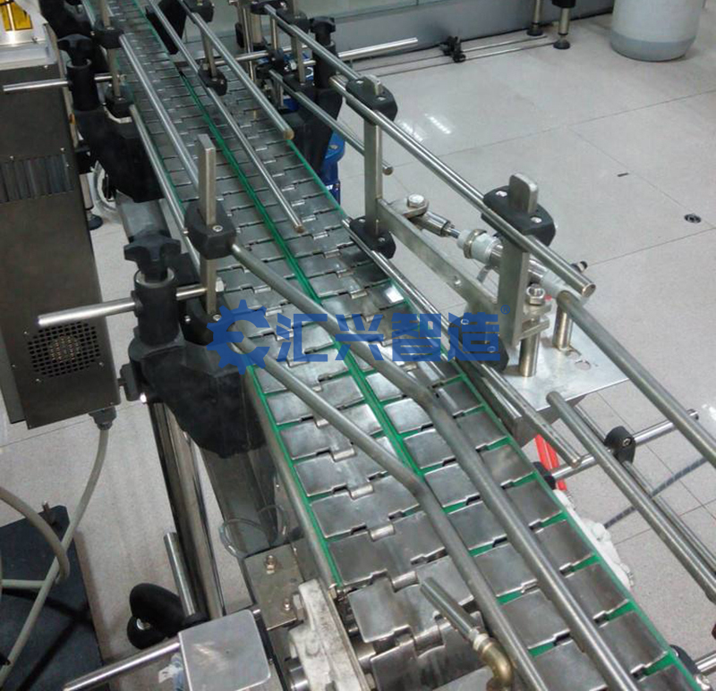 鏈板輸送線以標準鏈板為承載面,由馬達減速機為動力傳動;我們可以通過多列鏈板并行,使鏈板輸送線做的很寬并形成差速,利用多列鏈板的速度差使多列輸送在無擠壓的情況下變為單列輸送,從而滿足飲料貼標、灌裝、清洗等設備的單列輸送的要求,同樣也可以使單列變成多列并行走緩慢,從而產生儲存量,滿足殺菌機、儲瓶臺、冷瓶機的大量供料的要求,我們可以將兩條鏈板輸送線的頭尾部做成重疊式的混合鏈使得瓶(罐)體處于動態過度狀態,使輸送線上不滯留物料,可以滿足空瓶以及實瓶壓力和無壓力輸送。