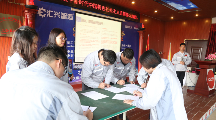璞玉有瑕,有先進(jìn),就有落后,有表?yè)P(yáng),就有懲戒。沒(méi)有規(guī)矩,不成方圓,所以大會(huì)的第四個(gè)議程對(duì)公司管理制度做了進(jìn)一步宣講和引導(dǎo)。人事經(jīng)理袁侃結(jié)合實(shí)際案列,諄諄告誡全體員工遵守法律、行政法規(guī)、公司制度,不要以身試法、以身犯險(xiǎn)。并發(fā)起第五個(gè)會(huì)議議程,倡議匯興智造全體員工簽訂《防火、防盜安全協(xié)議書》,各部門負(fù)責(zé)人率先上臺(tái)在協(xié)議書上簽字,用實(shí)際行動(dòng)表決心。