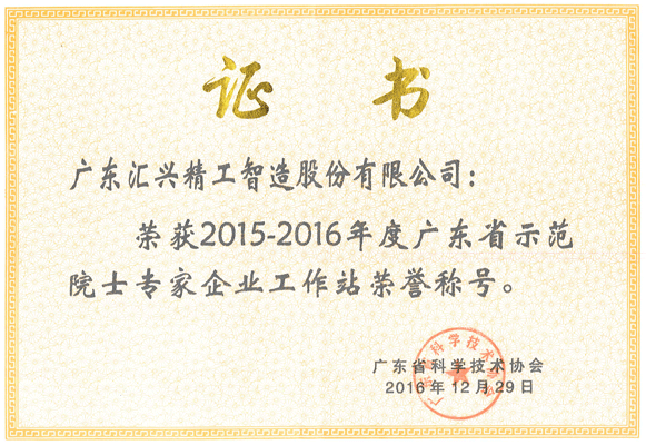 匯興智造廣東省示范院士專家企業(yè)工作站榮譽(yù)證書
