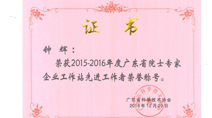 匯興智造董事長鐘輝榮獲2015-2016年度廣東省院士專家企業工作站先進工作者。