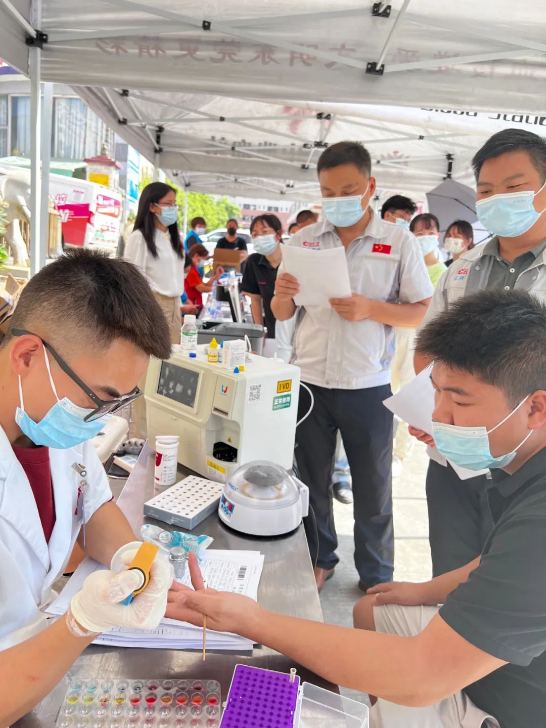 當天,總部大門口參加獻血的職工早早在獻血屋排起了隊,有條不紊地登記信息、化驗檢測、獻血。在這些獻血員工當中,有的是已經數次參加無償