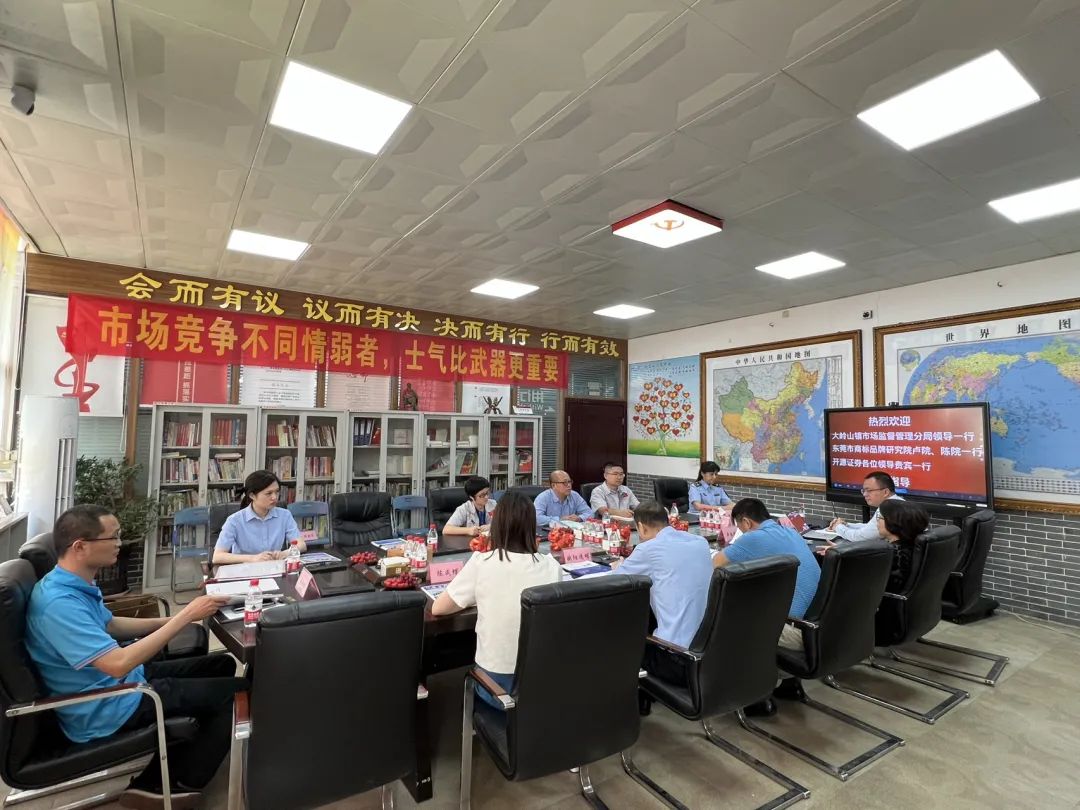 5月15日,大嶺山市場監(jiān)管局調研員高級主辦劉明周、監(jiān)管二股股長歐陽送明一行,東莞市商標品牌研究院榮譽院長盧靜娜、副院長陳成蝶、智庫專家周沛
